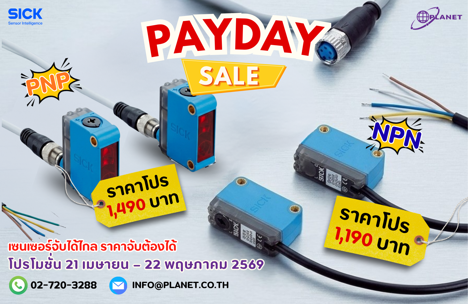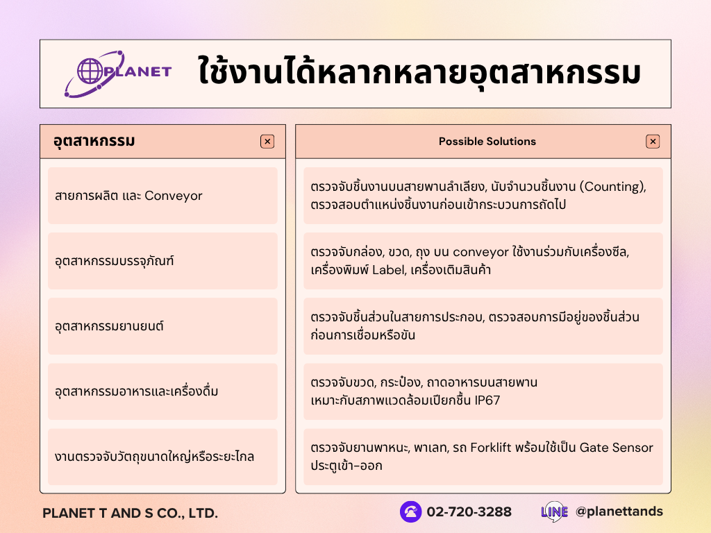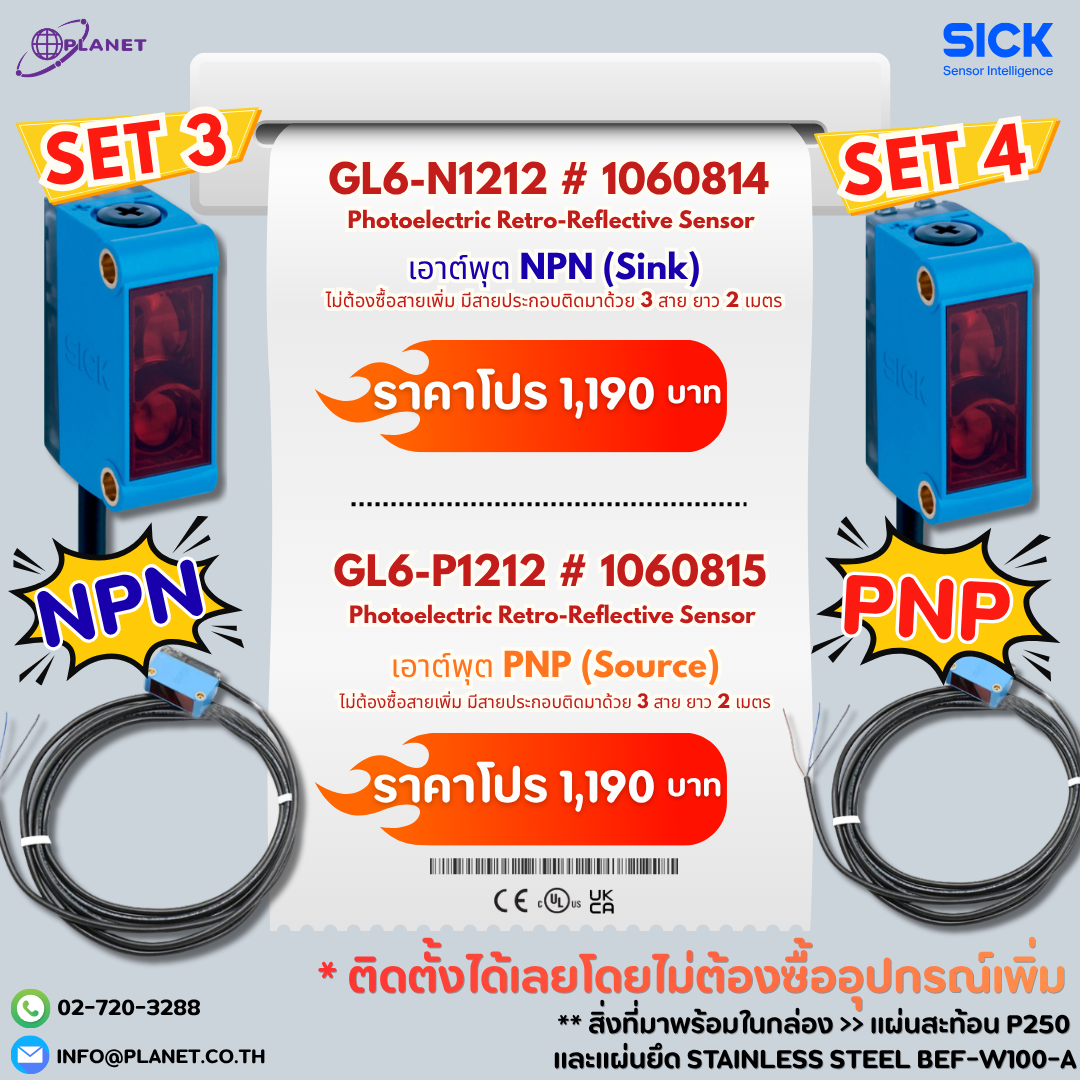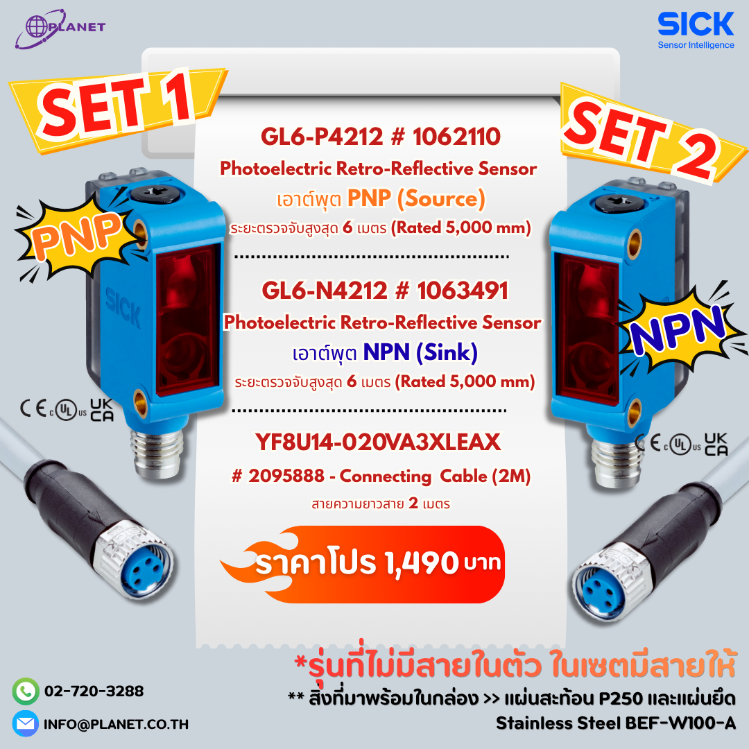 SICK GL6 Series มาตรฐานอุตสาหกรรมระดับโลก — เซนเซอร์และอุปกรณ์ที่จำเป็นมาครบในกล่องเดียว ไม่ต้องเสียเวลาหาซื้อสายหรือแผ่นสะท้อนแยก เปิดกล่องปุ๊บ ติดตั้งได้เลย... เหมาะสำหรับสายการผลิต Conveyor อุตสาหกรรมบรรจุภัณฑ์ ยานยนต์ อาหารและเครื่องดื่ม และงาน Gate Sensor โดยเฉพาะ และในช่วงเวลาสุดพิเศษนี้ Planet T and S ลดแรง! ให้คุณแบบจัดเต็ม! ตั้งแต่ 21 เมษายน – 22 พฤษภาคม 2569 เท่านั้น — สต็อกมีจำกัด สั่งซื้อได้เลยวันนี้!