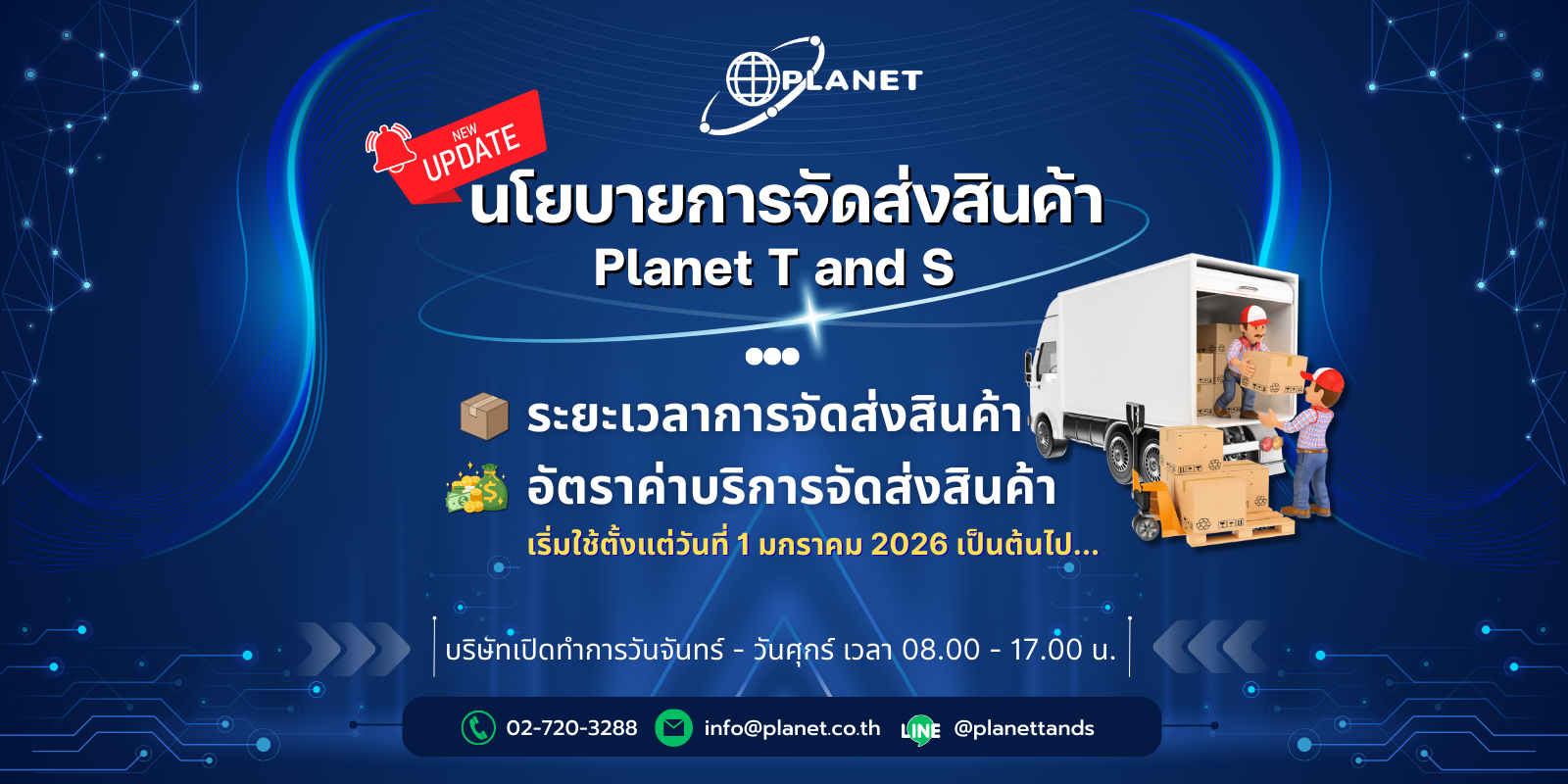 บริษัท แพลนเนท ที แอนด์ เอส จำกัด ขอเรียนแจ้งลูกค้าทุกท่านเกี่ยวกับระยะเวลาการจัดส่งสินค้า และอัตราค่าบริการขนส่งสินค้าใหม่ ปี 2026 โดยจะเริ่มใช้ตั้งแต่วันที่ 1 มกราคม 2026 เป็นต้นไป เพื่อให้การบริการมีประสิทธิภาพมากขึ้น และจัดส่งสินค้าได้อย่างตรงเวลา