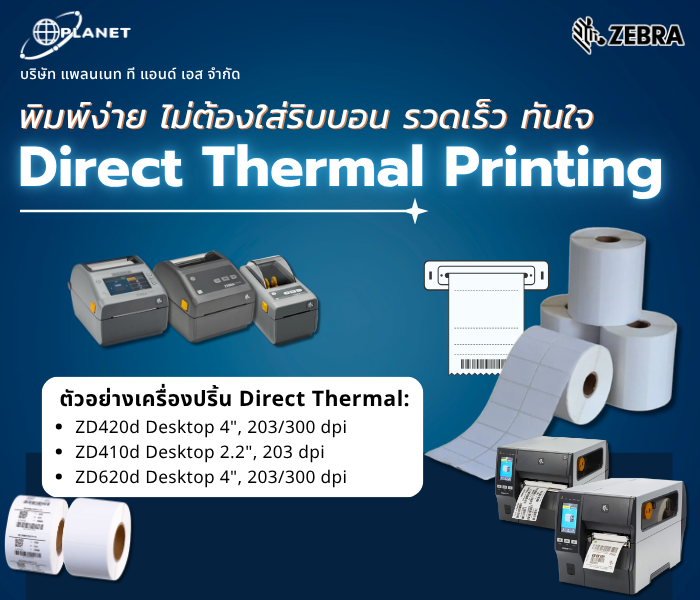 การพิมพ์แบบ Direct Thermal เป็นระบบที่ใช้ความร้อนจากหัวพิมพ์กดลงบนกระดาษเคมีที่ไวต่อความร้อน ทำให้เกิดภาพหรือข้อความขึ้นโดย ไม่ต้องใช้หมึก (Ribbon)