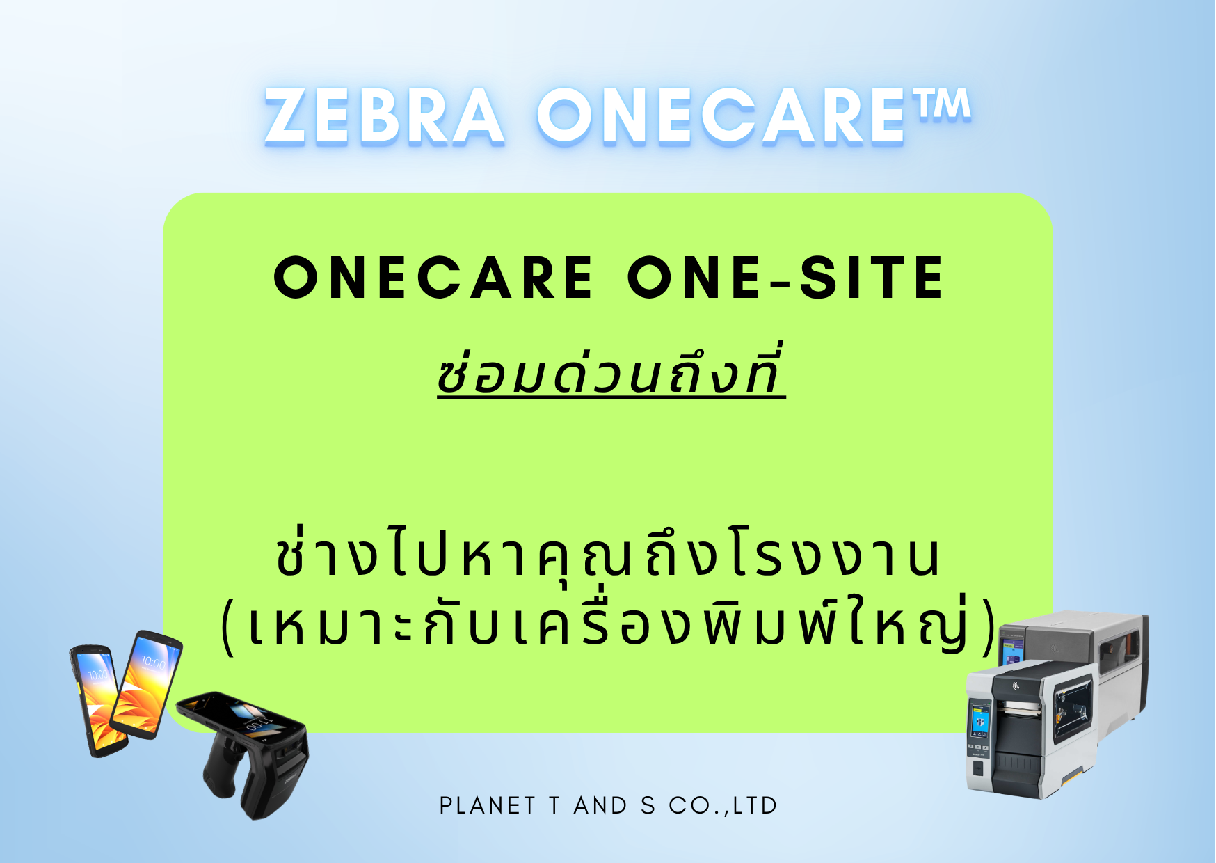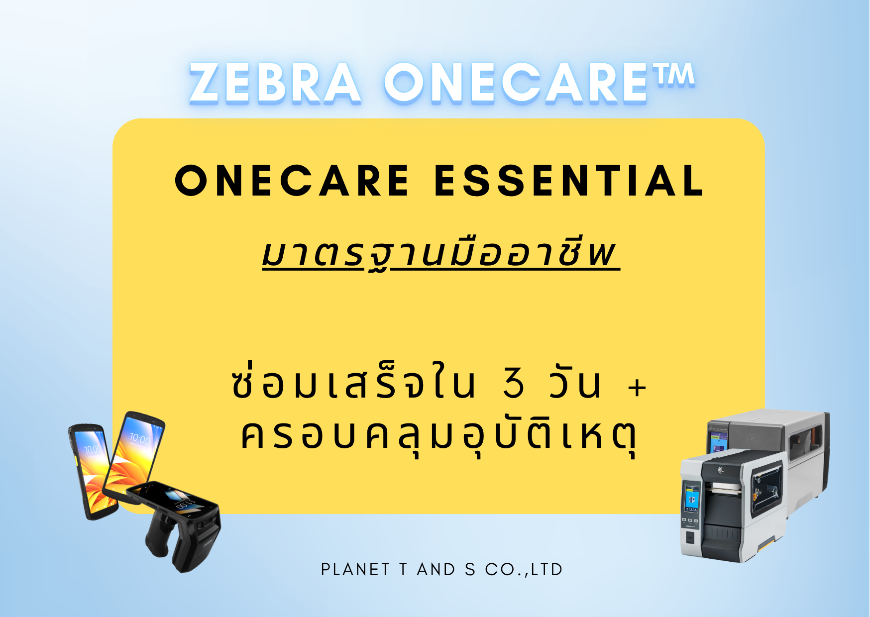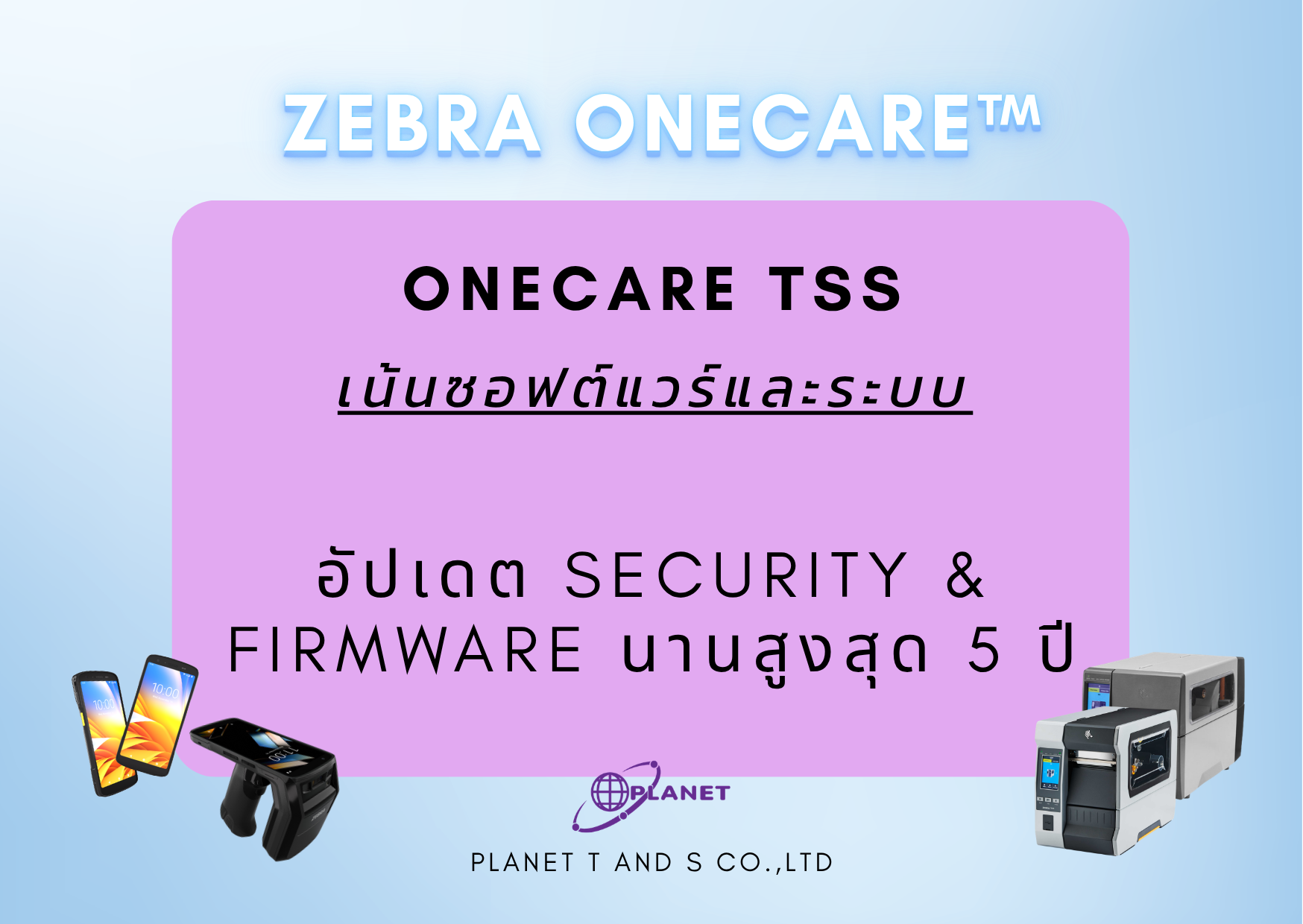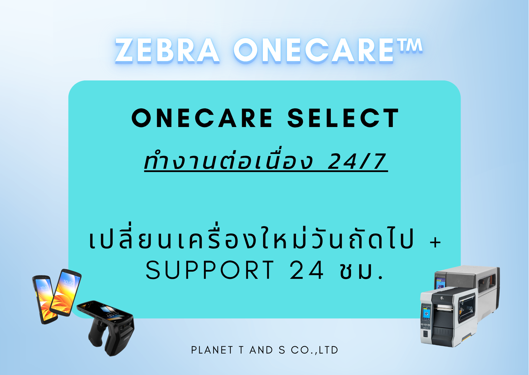 Zebra OneCare “เพราะเราแคร์กัน” คือคำสัญญาจาก Planet T and S ว่าเราจะอยู่เคียงข้างและดูแลให้อุปกรณ์ของคุณทำงานได้อย่างเต็มประสิทธิภาพที่สุด เพื่อให้คุณโฟกัสกับการเติบโตของธุรกิจได้อย่างเต็มที่